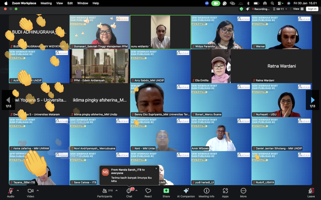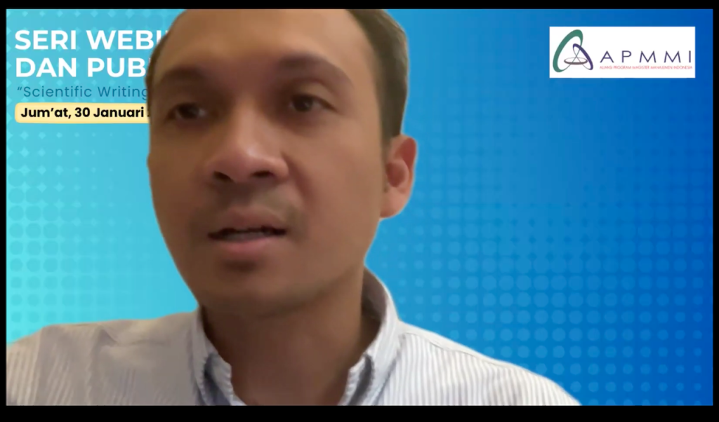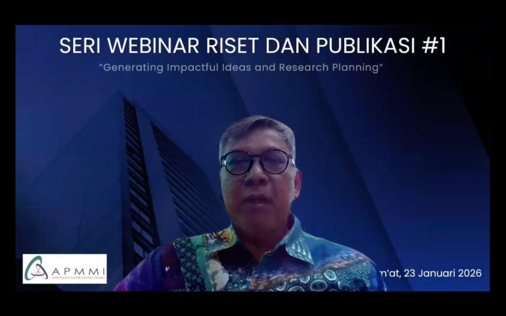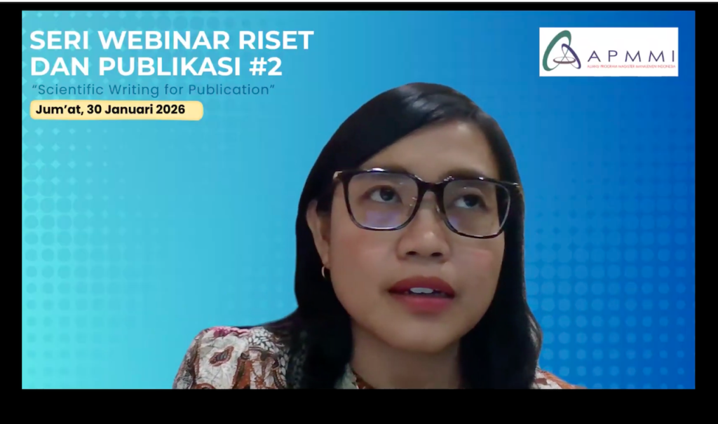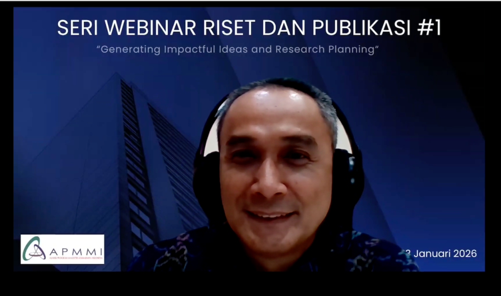 Aliansi Program Magister Manajemen Indonesia (APMMI) kembali menyelenggarakan Seri Webinar Riset dan Publikasi yang terdiri atas dua sesi bertajuk “Generating Impactful Ideas and Research Planning.” dan “Scientific Writing for Publication.” Kegiatan ini merupakan bagian dari komitmen APMMI dalam memperkuat kapasitas riset dan publikasi dosen serta mahasiswa Magister Manajemen di Indonesia. Kedua webinar menghadirkan narasumber utama, Ibu Widya Paramita, S.E., M.Sc., Ph.D., Kaprodi Magister Sains dan Doktor Manajemen FEB Universitas Gadjah Mada, yang juga berpengalaman sebagai Editor in Chief dan Editor di sejumlah jurnal bereputasi internasional. Melalui dua sesi ini, peserta memperoleh perspektif komprehensif mengenai bagaimana merancang penelitian yang berdampak serta strategi mengkomunikasikannya agar memiliki peluang publikasi yang lebih besar.